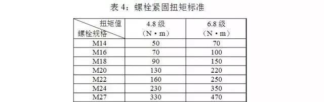 連接螺栓應逐個緊固,螺栓的扭緊力矩不應小于表 4 的規定。若發現螺桿與螺母的螺紋有滑牙或螺母的棱角磨損以致扳手打滑的,應更換螺栓、螺母。